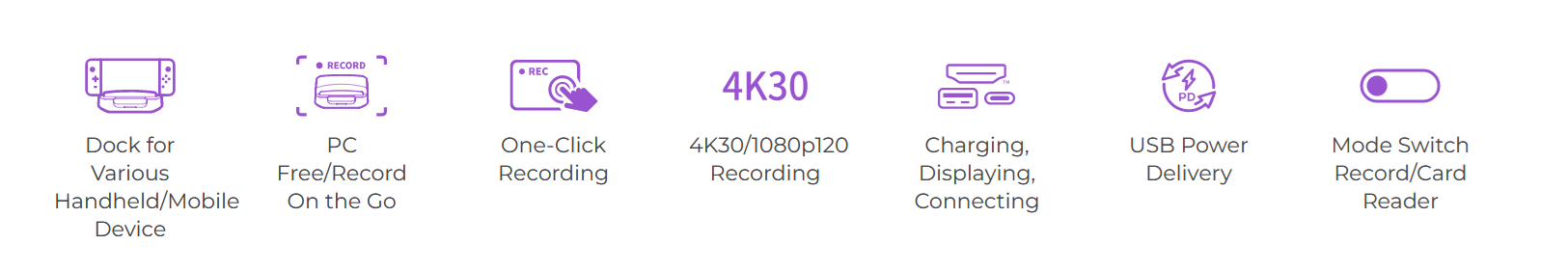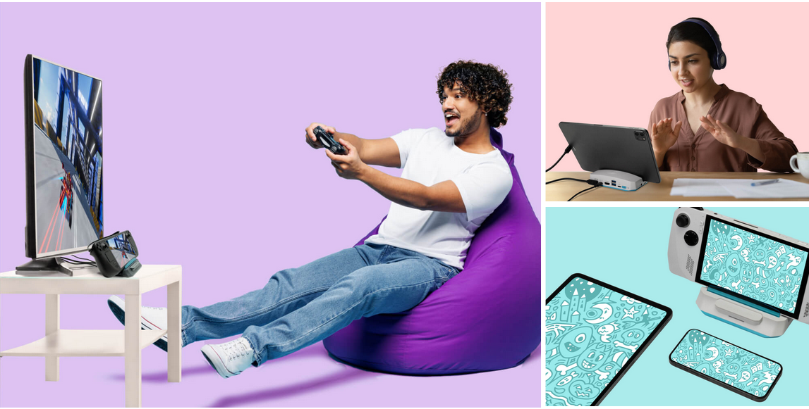 For vloggers, digital nomads, and IRL streamers, the GC515 allows you to record content from your handheld, phone, or tablet on the go. The dock can be powered by a 65W power bank or plane power sockets, ensuring you’re always ready to create.