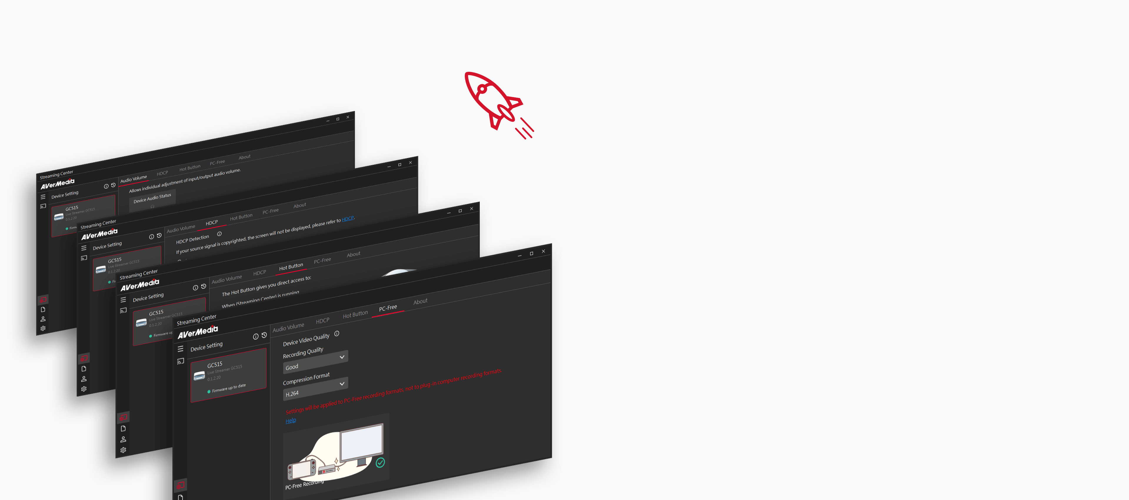 The Streaming Center serves as a centralized control hub for managing and optimizing all supported AVerMedia devices. The GC515 can be controlled directly from the device settings pages. For the PC-Free function, you can pre-configure the recording quality and video format to make the one-click feature more responsive.