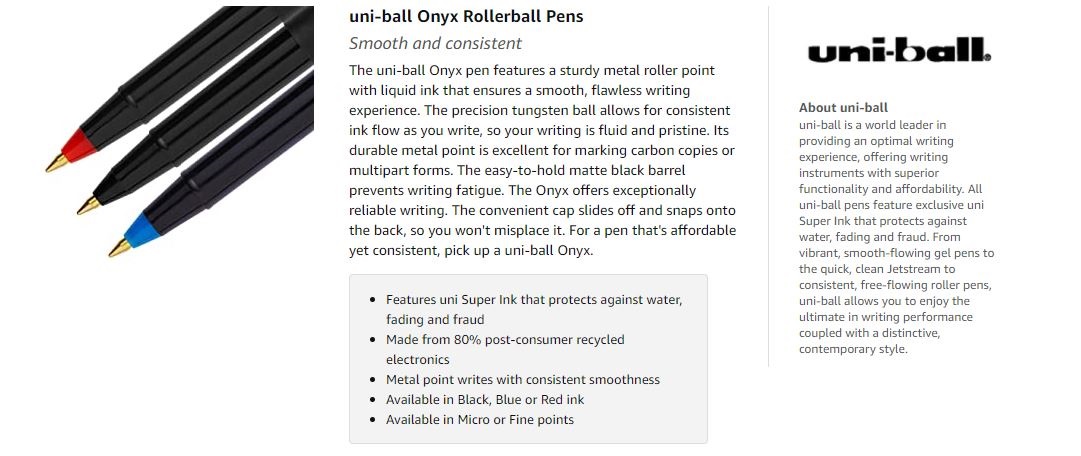 Affordable, reliable and consistent, the uni-ball Onyx features a sturdy metal roller point that ensures a flawless writing experience. The easy-to-hold matte black barrel is available in fine or micro point, in three colors. Made from 80% post-consumer recycled electronics.