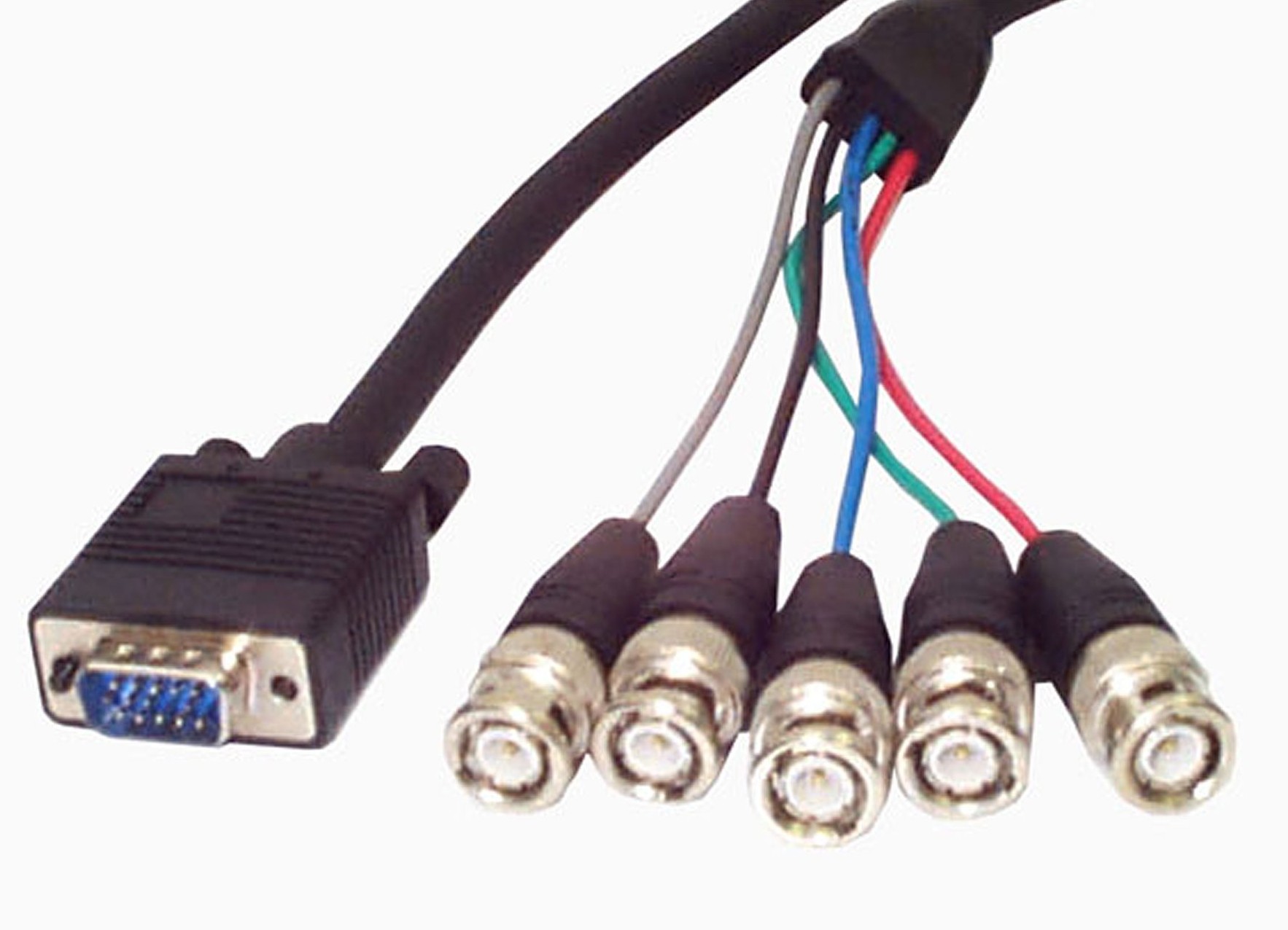 This 6ft Coax VGA Monitor Cable provides a VGA (HDDB15) connecter and a BNC male connector, allowing you to connect your PC VGA/SVGA port to a monitor with 5 BNC connectors. The cable can also be used with a VGA out signal, breaking out to 5 BNC male connectors that can be used with a BNC monitor/display.