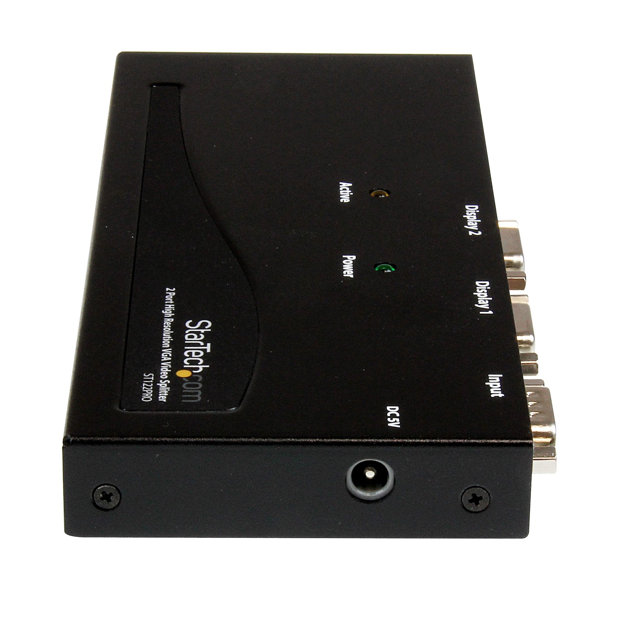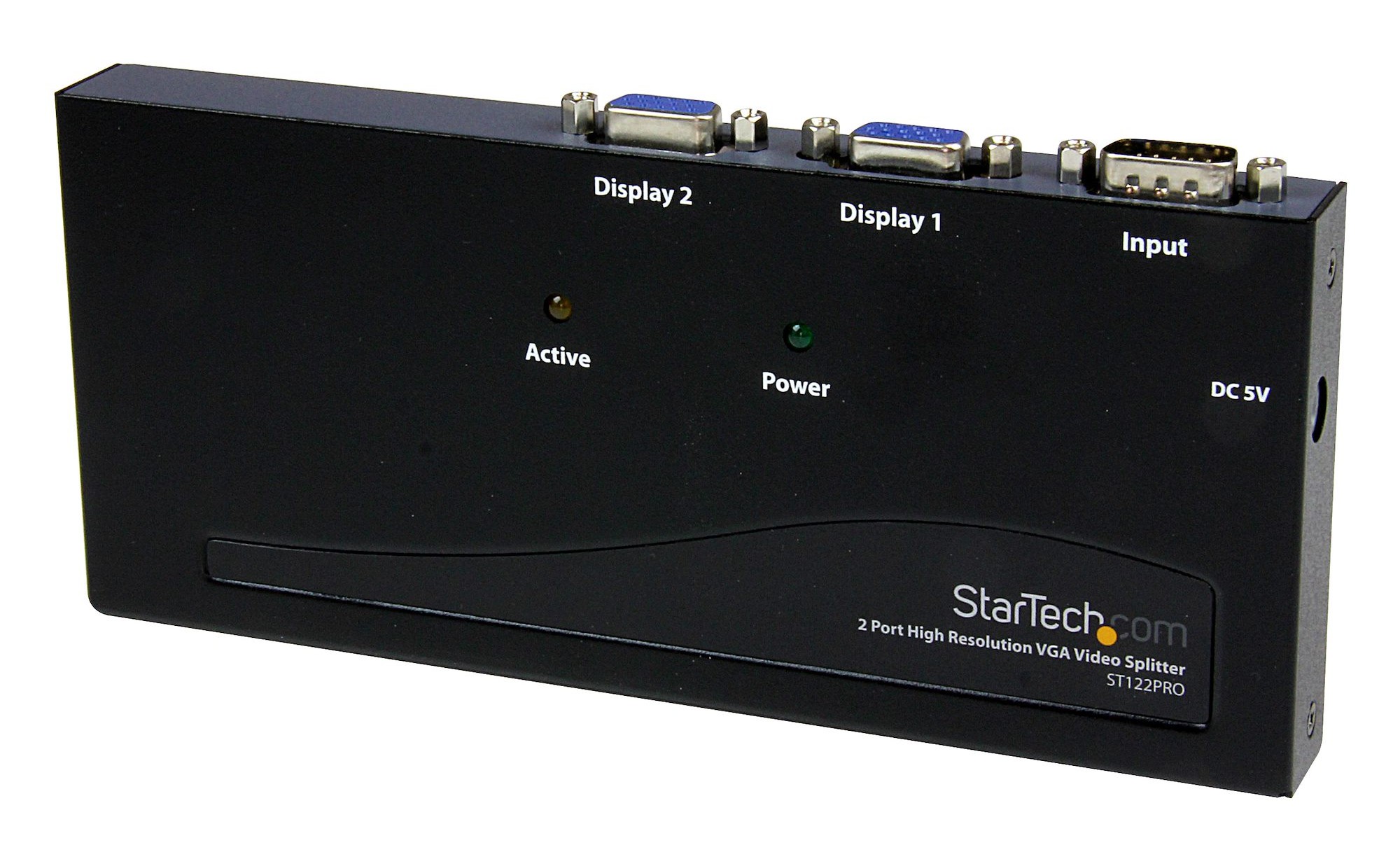 The ST122PRO 2 Port High Resolution VGA Video Splitter - 350 MHz splits a VGA video source signal to 2 monitors or projectors simultaneously - a professional grade solution that is perfect for presentations, classrooms, tradeshows, or in-store displays, where the highest quality video on several monitors is needed.