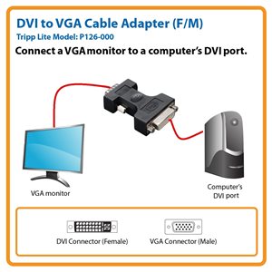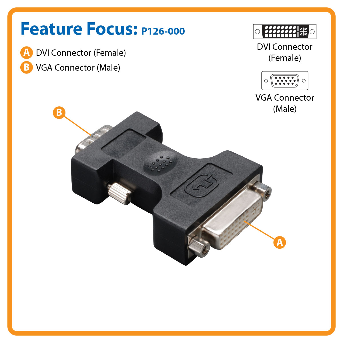 The Tripp Lite P126-000 adapter allows a monitor with a VGA (HD15) port, to connect to a DVI-I Video Graphics card, when using DVI-I Male/Male cables, such as Tripp Lite P561-006-SLI. The copper foil shielding cuts down on EMI/RMI interference improving overall performance and ensuring error free signal transfer.