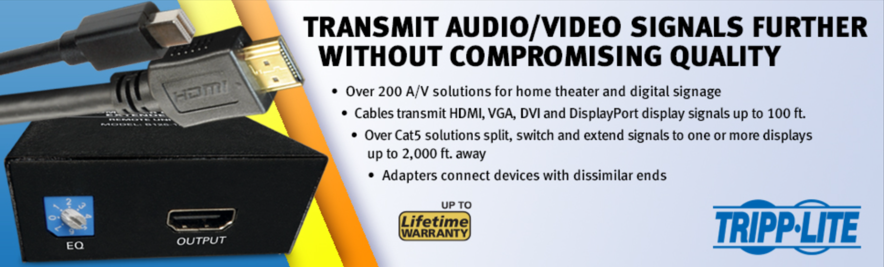 Founded in 1922 in Chicago, Illinois, Tripp Lite is a leading manufacturer of products to power, connect and protect your equipment. With a large selection of connectivity products, Tripp Lite has everything from USB hubs and reversible USB cables to fiber-optic cables and over Cat5e/Cat6 signal extenders. Whether you need to connect high-speed networks to switches, routers and servers in your data center, or send high-resolution video signals to displays and digital signs, Tripp Lite has the complete solution. Plus, before and after your purchase, our Chicago-based, in-house technical support specialists are available to assist you by phone, email and live chat. With over 90 years of quality products and service, Tripp Lite is a brand you can trust.