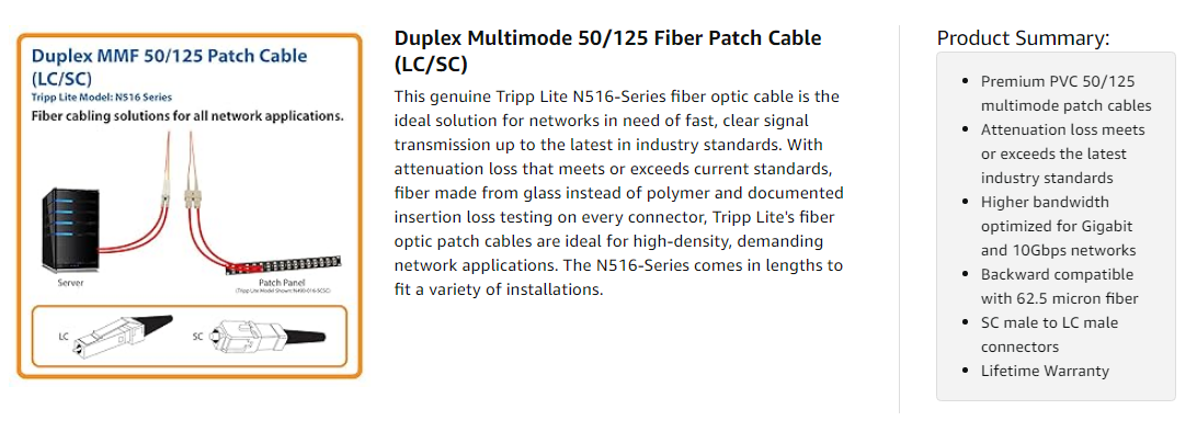 The N516-Series is manufactured using top quality materials. With 50/125 duplex fiber, a FDDI and OFNR-rated PVC jacket, sturdy connectors and fiber made from glass instead of a polymer, Tripp Lite's fiber optic cables are made to last in high-demand data center and networking applications.