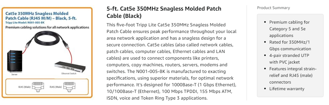 For peace of mind, this five-foot Tripp Lite Cat5e 350MHz Snagless Molded Patch Cable comes backed by a lifetime warranty. The N001-005-BK is manufactured in compliance with strict RoHS specifications, reflecting Tripp Lite’s commitment to environmental responsibility.
