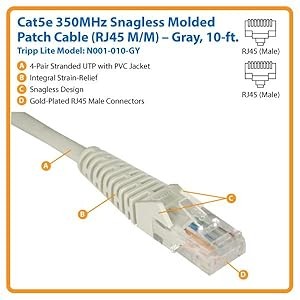 For peace of mind, this 10-feet. Tripp Lite Cat5e 350 MHz Snagless Molded Patch Cable comes backed by a lifetime warranty. The N001-010-GY is manufactured in compliance with strict RoHS specifications, reflecting Tripp Lite’s commitment to environmental responsibility.