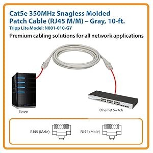 This 10-feet. Tripp Lite Cat5e 350MHz Snagless Molded Patch Cable is the ideal solution for connecting network components like computers, printers, internet-enabled gaming systems and Blu-ray players, copy machines, routers and modems in a home or office application.