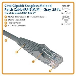 For peace of mind, this 25 feet Tripp Lite Cat6 Gigabit Snagless Molded Patch Cable comes backed by a lifetime warranty. The N201-025-GY is manufactured in compliance with strict RoHS specifications, reflecting Tripp Lite’s commitment to environmental responsibility.