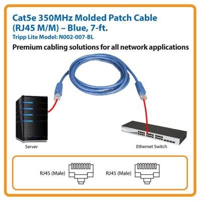 Don’t settle for less than the best—enjoy better signal quality and faster transmission! This seven-foot Tripp Lite Cat5e 350MHz Molded Patch Cable ensures peak performance throughout your local area network application. Cat5e cables (also called network cables, patch cables, computer cables, Ethernet cables and LAN cables) are used to connect components like printers, computers, copy machines, routers, servers, modems and switches. The N002-007-BL is manufactured to exacting specifications, using superior materials, for optimal network performance. It’s designed for 1000Base-T (1 Gbps Ethernet), 10/100Base-T (Ethernet), 100 Mbps TPDDI, 155 Mbps ATM, ISDN, voice and Token Ring Type 3 applications. For peace of mind, the N002-007-BL comes backed by a lifetime warranty and has an eco-friendly, RoHS-compliant design.