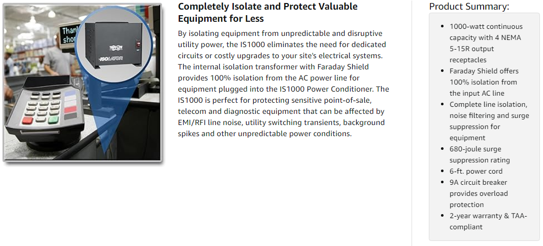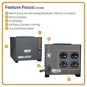 The IS1000’s 1000 watt capacity can handle a variety of electronic devices, while additional features like a 680-joule surge suppression rating, integrated 9-amp circuit breaker and powerful line noise filtering ensure ultimate protection and safety in even the most hazardous conditions. With continuous transformer filtering and no wearable parts, the IS1000 reduces surges in the worst power environments to harmless levels.