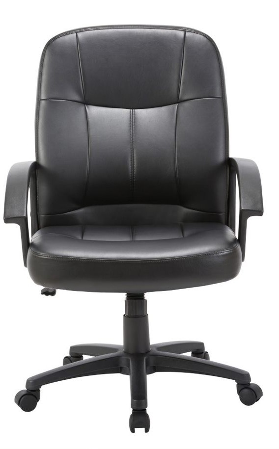 Managerial mid-back chair offers a fully upholstered design with black, split leather for a rich classic look. Black frame has stylish open loop arms and five-star nylon base with casters for mobility. Functions include pneumatic seat-height adjustment, 360-degree swivel, tilt and tilt tension. Seat cushion is 21-1/2" wide x 19-1/2" deep. Seat back measures 21" wide x 25-1/2" high. Mid-back chair meets the CA117 fire-retardant standard.