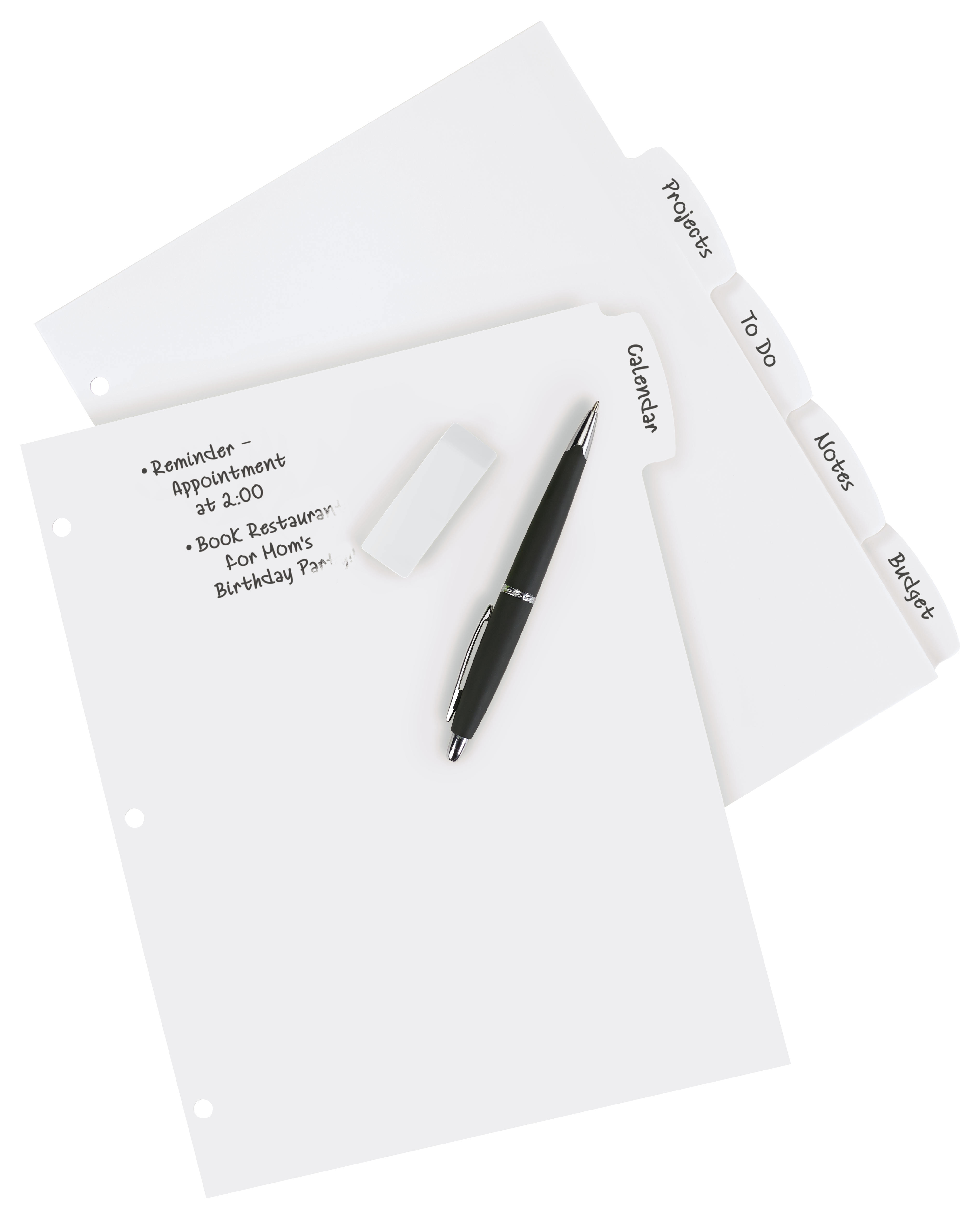 Avery Write and Erase Dividers let you write directly on the tabs with a ballpoint pen or pencil, and easily erase when a change is needed.