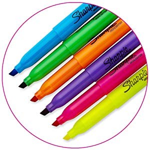 Thin, easy to control and filled with bright, quick-drying ink, Sharpie Pocket Highlighters make it simple to mark up important documents. The specially formulated Smear Guard ink protects your work as you highlight over most pen and marker inks, as long as you wait for them to dry first. Plus, these slender highlighters fit easily in pockets and bags, allowing you to take your Sharpie highlighters everywhere. With a sturdy chisel tip, these highlighters clearly highlight important words or underline sections of text.
