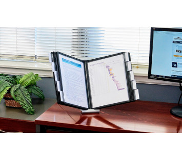 The InstaView Desktop Reference System from Durable is economical, functional, and an ideal organizational tool for customer service, sales, and general office use. It is easily expandable by connecting additional systems with each other (connectors included) and features glare-free polypropylene sleeves with rugged black frames. Also available with frames in assorted colors - two each in red, black, yellow, blue, and green (DBL5612-00). Includes desk stand, 10 sleeves (20 viewing sides) and 5 snap-on tabs.