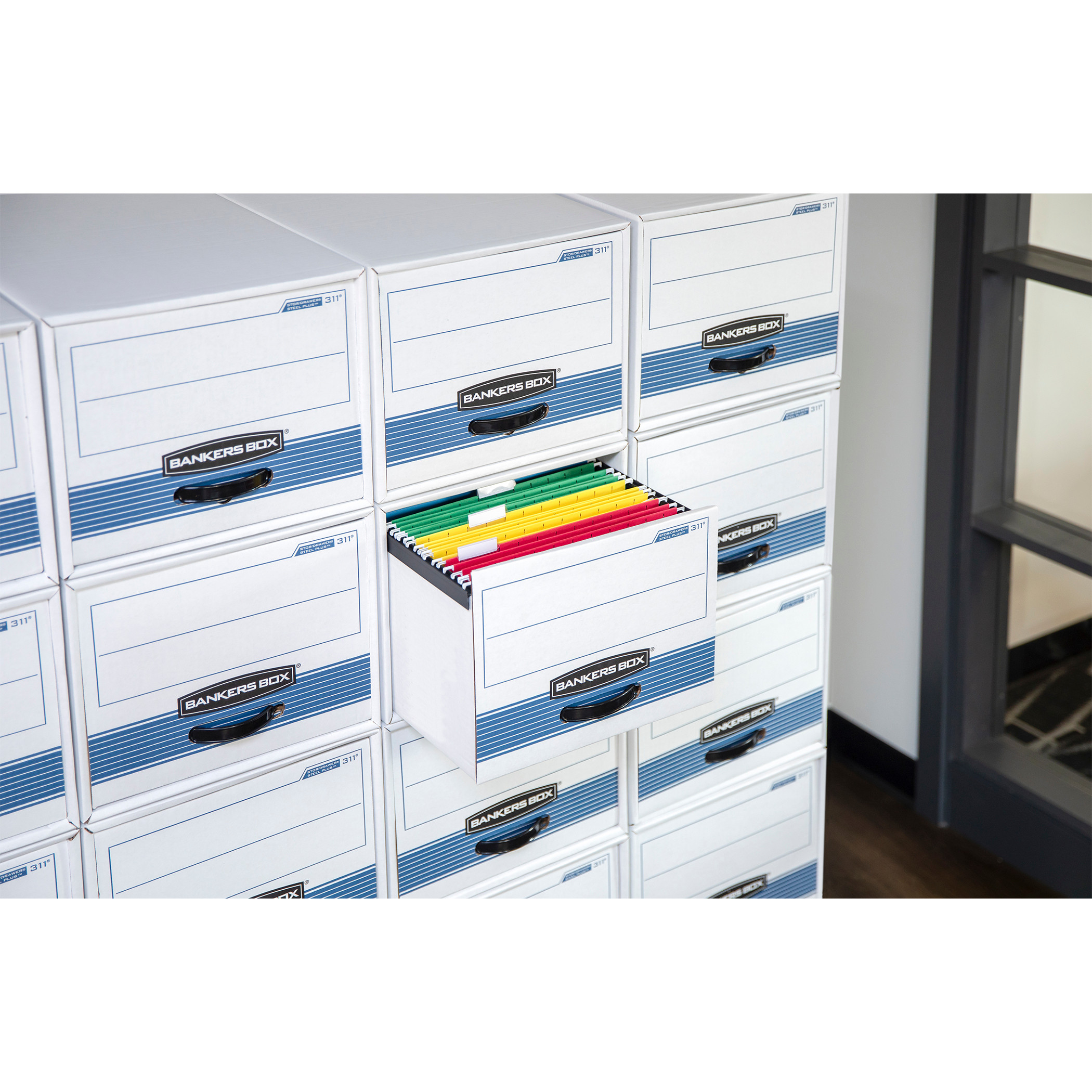 Bankers Box Stor/Drawer Steel Plus Storage Drawers offer a smart and efficient way to organize files in your home or office. Constructed with a steel support frame, the Extra Space-Saving drawers can be stacked up to five units high. Reinforced plastic handles provide easy drawer access, while removable rails make it easy to hang files.Stor/Drawer Steel Plus storage drawers are made from heavy-duty corrugate with four-layer reinforcement on the front and back to withstand heavy day-to-day usage. The drawers include a reinforced plastic handle for fast file retrieval and removable rails to accommodate hanging files.