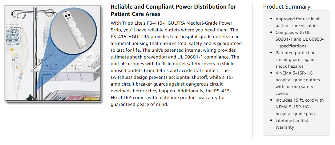 UL 60601-1 compliance is required for power strips within patient care areas in order to avoid hazardous conditions and provide a safe environment for patients, staff and visitors. With patented internal wiring to reduce the shock potential of connected equipment, keyhole mounting installation, a rugged housing and plenty of outlets, Tripp Lite's PS-415-HGULTRA is designed for patient care applications. It is fully UL 60601-1 compliant and provides reliable, consistent power service for multiple devices. The keyhole mounting slots and long cord allow the PS-415-HGULTRA to be installed wherever reliable, multi-outlet power distribution is required.With 4 hospital-grade outlets, the PS-415-HGULTRA is perfect for medical applications or locations that require simultaneous power to multiple devices. When not in use, outlets can be protected from debris and accidental contact with the built-in outlet safety covers. A rugged, all-metal housing makes the PS-415-HGULTRA a great power distribution solution for physically demanding environments.Install the PS-415-HGULTRA far away from its power source and distribute power to previously un-powered areas with the long, 15-foot power cord with hospital-grade 5-15P-HG plug. The PS-415-HGULTRA can be mounted in a different area or room from where it draws AC power, putting users in control of supplying reliable power service where it is needed most.