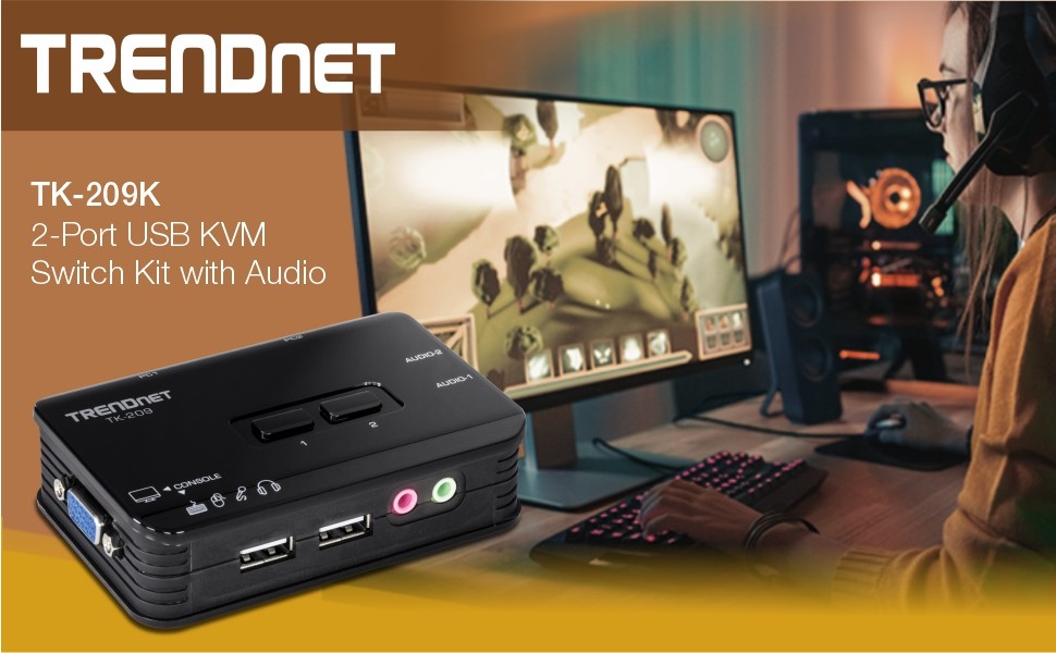 TRENDnet's 2-Port USB KVM Switch Kit with Audio, model TK-209K, allows you to control multimedia PCs with just one keyboard, monitor, mouse, microphone, and a set of speakers. The KVM switch not only allows you to share your monitor, keyboard and mouse, but you can also share microphone and speakers. With just a simple press of a button, this KVM switch eliminates the hassle of cable swapping and switching between 2 PCs. With its Hot-Plug, Auto-Scan, and Hot-Key operating features, the TK-209K KVM Switch is an ideal choice for managing 2 PCs.