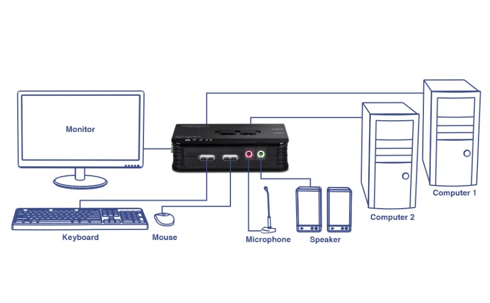 This VGA KVM switch features 3.5mm speaker and microphone connections to switch between computers
