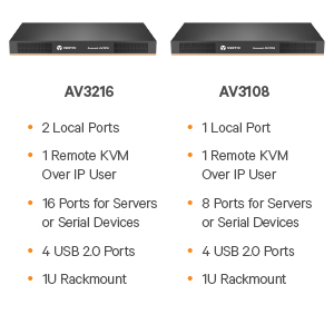 The Vertiv Avocent AV 3000 KVM over IP Switches is offered in two models. The 8-port switch (AV3108) supports one local and one remote user and up to eight server or serial devices. The 16-port switch (AV3216) supports up to two local and one remote user and 16 server or serial devices. Vertiv Avocent AV 3000 KVM over IP Switches provide consolidated management of up to 256 server or serial devices when tiered.