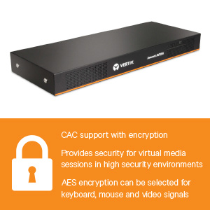 Grant access to specified users or implement LDAP directory authentication, and limit KVM access to specific targets on the switch with the Vertiv Avocent AV 3000 KVM over IP Switches. CAC support with encryption for smart cards and password protection for local users, provides security for virtual media sessions in high security environments. AES encryption can be selected for keyboard, mouse and video signals and virtual media sessions.
