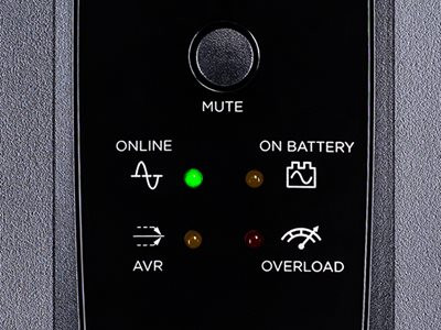 To turn the alarm off, press the button for 2 seconds. While muted, there will be no audible notification when the UPS reaches a lower battery state. Repeat steps to enable alarm.