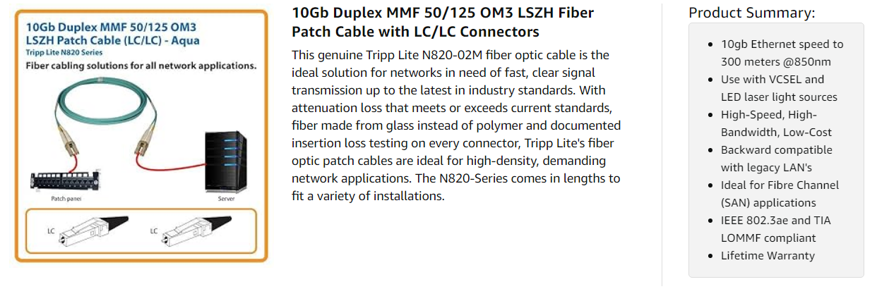 The N820-02M is manufactured using top quality materials. With 10Gb 50/125 duplex fiber, a Low-Smoke, Zero Halogen (LSZH) jacket, sturdy connectors and fiber made from glass instead of a polymer, Tripp Lite's fiber optic cables are made to last in high-demand data center and networking applications.
