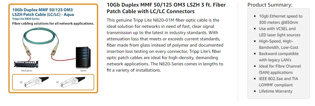 The N820-01M is manufactured using top quality materials. With 10Gb 50/125 duplex fiber, a Low-Smoke, Zero Halogen (LSZH) jacket, sturdy connectors and fiber made from glass instead of a polymer, Tripp Lite's fiber optic cables are made to last in high-demand data center and networking applications.