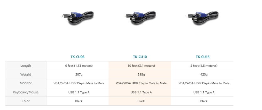 This 2-in-1 USB KVM cables are designed to connect a USB computer to the TRENDnet TK-803R and TK-1603R KVM switches. These cables consist of a USB keyboard/mouse cable and monitor cable bonded into a single device. These flexible, low profile cables come in lengths of 6, 10 and 15 feet.
