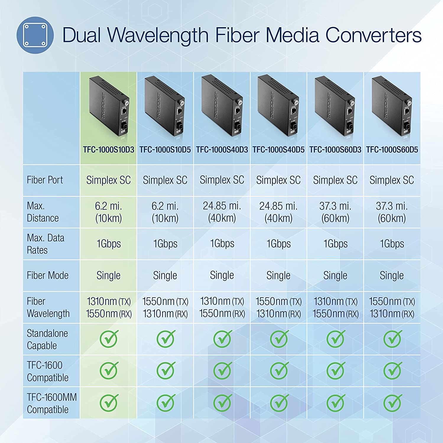 TRENDnet’s TFC-1000MSC, Intelligent Fiber Converter, is compatible with the TFC-1600 chassis system or functions as a standalone unit. This converter is a Multi-Mode SC-Type fiber converter that supports SNMP (when used TFC-1600MM) and spans distances up to 550 m (1,800 ft.). Ports include a 1000Base-T (RJ-45) port and a 1000Base-SX (SC-Type) fiber port.