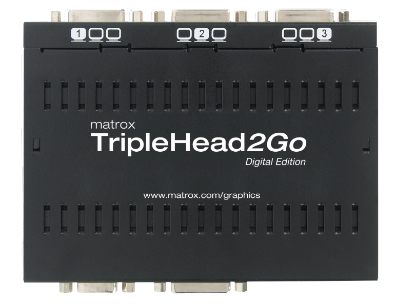 The Matrox TripleHead2Go Digital Edition external multi-display adapter adds up to three monitors to your laptop or desktop computer. It connects to the video output of your system and uses the system's existing GPU to provide high-quality, uncompressed graphics and video across all monitors. Ideal for professionals requiring more desktop space for maximum productivity and gamers wanting a totally immersive experience, this little black box lets you run different applications on each display or view one application across multiple monitors. Organize your workspace more efficiently, multi-task more comfortably and make fewer errors with a Matrox TripleHead2Go-powered multi-monitor setup.