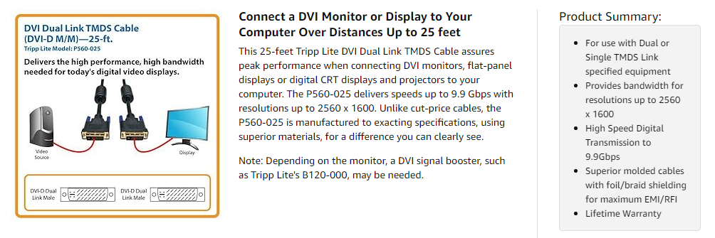 The P560-025 is manufactured using top-quality materials. Premium double-shielded foil-and-braid cable with paired video wire construction provides maximum EMI/RFI protection and superior signal quality. The P560-025 features gold-plated DVI-D connectors with gold-plated copper contacts to ensure excellent conductivity. The connectors feature integral strain relief for durability and reliability.