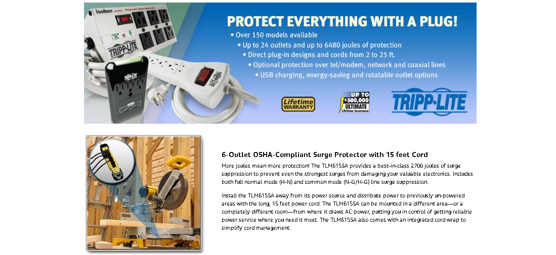 For peace of mind, the TLM615SA comes backed by a lifetime warranty and an Ultimate Lifetime Insurance (USA, Canada and Puerto Rico only) for any connected components damaged by a power surge. The TLM615SA is also manufactured in compliance with strict RoHS specifications, reflecting Tripp Lite’s commitment to environmental responsibility.
