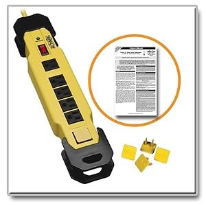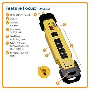 A lighted On/Off switch provides convenient power control and allows you to see at a glance whether the TLM615SA is operational. A green LED confirms surge protection status. Four included outlet safety covers keep debris and moisture away from unused outlets, making the TLM615SA safe and reliable to use in even the harshest of worksite environments. A built-in, 15-amp circuit breaker prevents dangerous circuit overloads that could damage equipment by immediately shutting off AC input to the TLM615SA when it detects that the equipment load is drawing too much power. The unit’s OSHA-compliant yellow color alerts users to potentially hazardous situations.