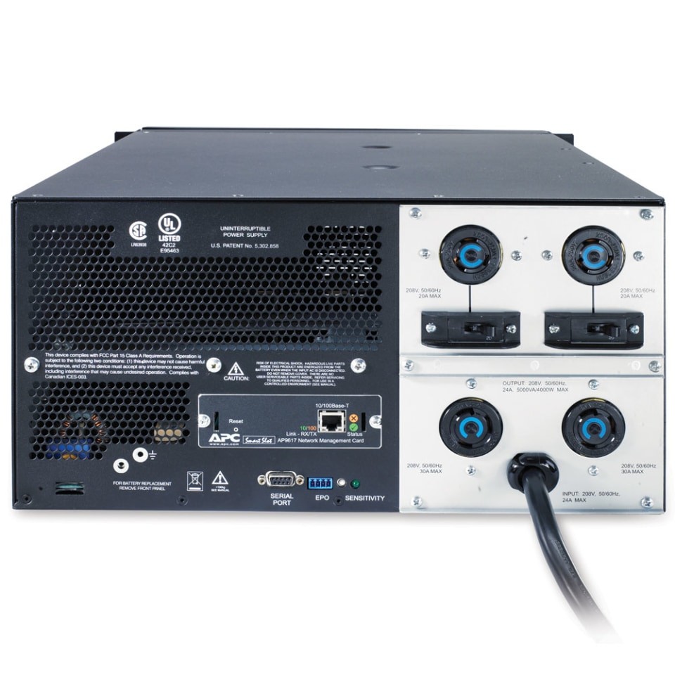 The Smart-UPS SUA5000RMT5U is covered by a two-year limited warranty. The UPS also comes with a lifetime equipment protection policy of up to $150,000. APC will repair or replace office equipment that sustains surge-related damage while properly connected to a registered APC Smart-UPS unit.