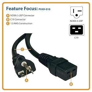 Unlike cut-price power cords, the P049-010 is manufactured using superior materials and is UL-listed for optimal product safety. The high-quality connectors are designed for reliable service and long life. This SJT cable has three 12 AWG conductors and is rated at 20A for cooler operation.