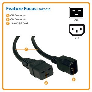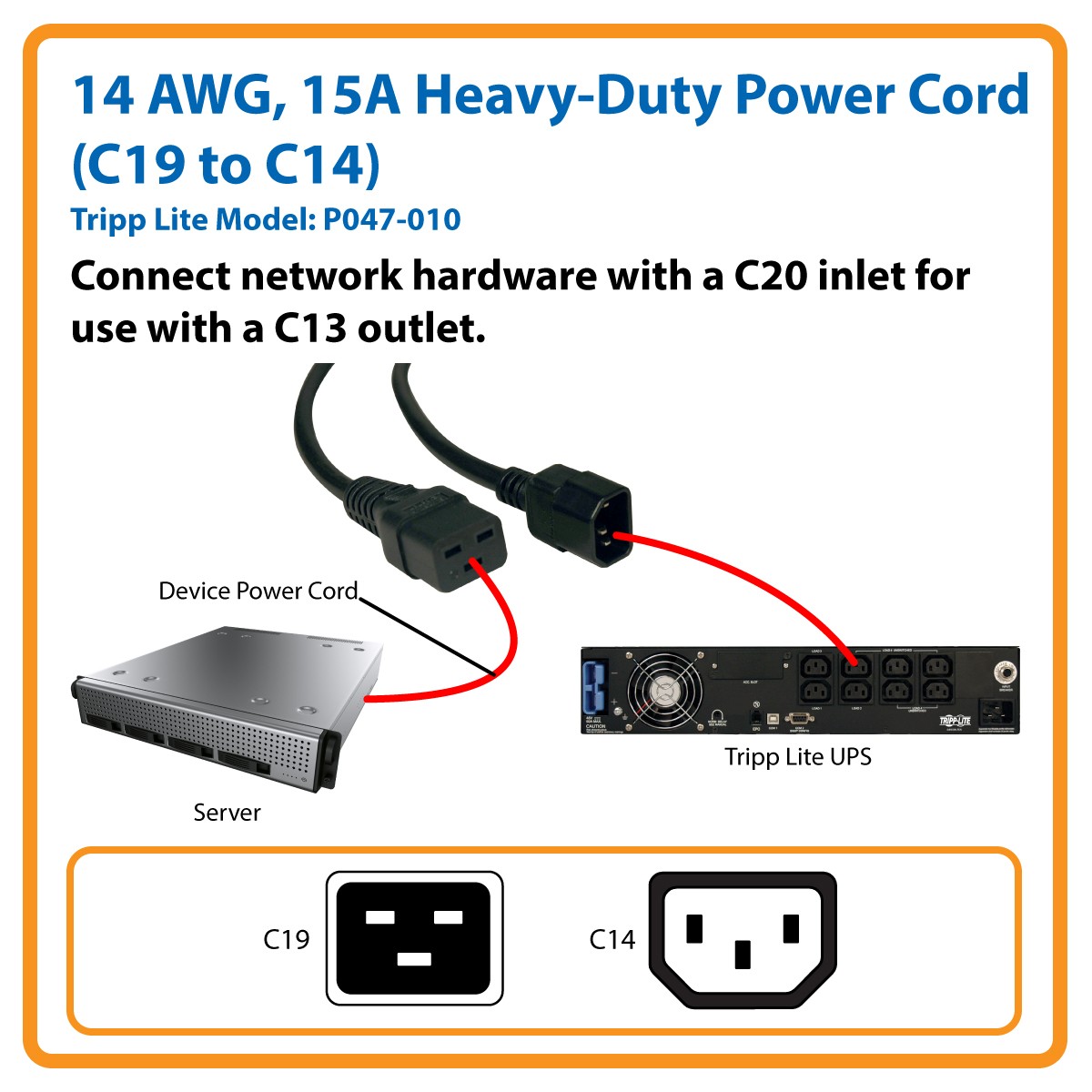Tripp Lite’s P047-010 10-foot, Heavy-Duty Power Cord is the ideal solution for network hardware that requires higher rated, heavier gauge cables. Featuring a C14 connector on one end and a C19 connector on the other, the P047-010 can be used as an extension cord to increase the functionality of an existing cable or as a single power cord that’s just the right length to connect equipment to a UPS or PDU. Simply connect the C19 end to your hardware and the C14 end to an existing server power cord, UPS, PDU, surge protector or other compatible AC source.