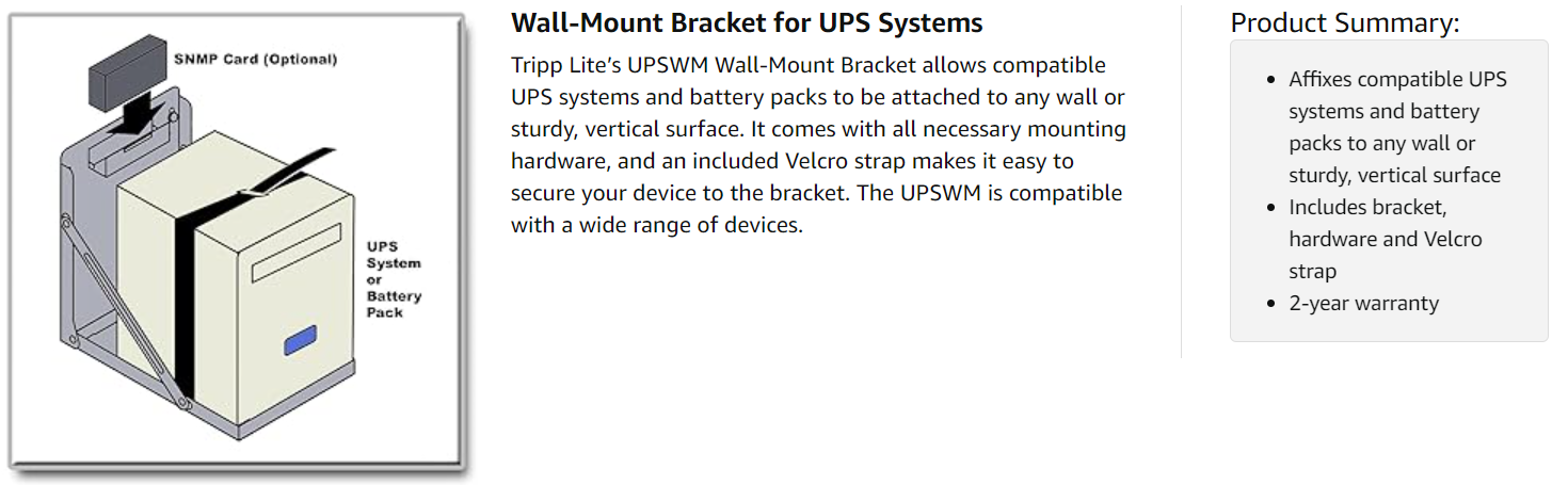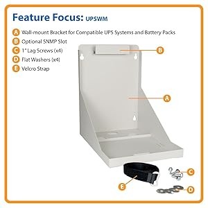 The UPSWM is compatible with a variety of Tripp Lite UPS systems, including the BCPERS300, BCPERS450, BCPRO600, BCPRO850, BCPRO1050, BCPRO1400, INTERNETOFFICE500, INTERNETOFFICE700, OMNISMART300, OMNISMART350HG, OMNISMART450HG, OMNISMART500, OMNISMART700, OMNISMART700HG, OMNISMART1050, ONMISMART1400, OMNISMART1400HG, OMNIVS800, OMNIVS1000, OMNIVS1500XL, SMART550USB, SMART700, SMART700SER, SMART700HG, SMART750USB, SMART1050, SMART1200XLHG, SMART1500, SMART1500XL, TE600, TE1200 and more. It is also compatible with Tripp Lite’s BP24V14 battery pack.