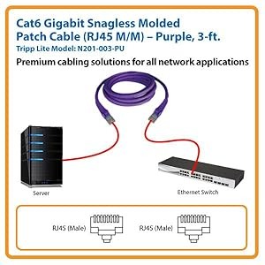 For peace of mind, this three-foot Tripp Lite Cat6 Gigabit Snagless Molded Patch Cable comes backed by a lifetime warranty. The N201-003-PU is manufactured in compliance with strict RoHS specifications, reflecting Tripp Lite’s commitment to environmental responsibility.
