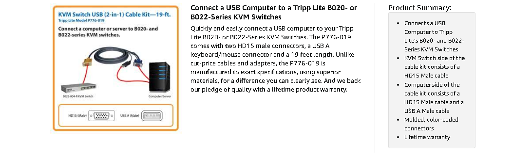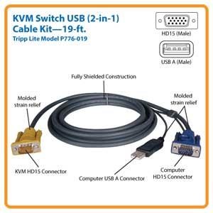 The P776-019 is manufactured using top-quality materials. With fully molded construction, the cable kit provides error-free, secure signal from Tripp Lite's USB KVMs to your console. The P776-019 is compliant with RoHS standards, reflecting Tripp Lite's commitment to environmental responsibility.