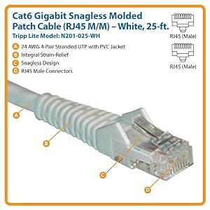 Manufactured from 24 AWG 4-pair stranded UTP with a staggered-pin plug design, the N201-025-WH provides high-speed connections and flawless signal delivery while keeping near-end crosstalk levels to a minimum. This cable can deliver speeds up to 550MHz/1 Gbps. Featuring a PVC jacket, this 25-feet. Tripp Lite Cat6 Gigabit Snagless Molded Patch Cable is constructed of top-quality materials for long life and durability. Its RJ45 (male) connectors are gold-plated to ensure an accurate signal transfer. For a secure connection, the cable has molded integral strain-relief and a snagless design that protects the locking tabs on the RJ45 connectors from being damaged or snapped off during installation. The N201-025-WH meets the most current industry standards, including IEEE 802.3ab, IEEE 802.5, ANSI/EIA/TIA 568, ISO/IEC 11801 and ETL (category 6 draft 11).