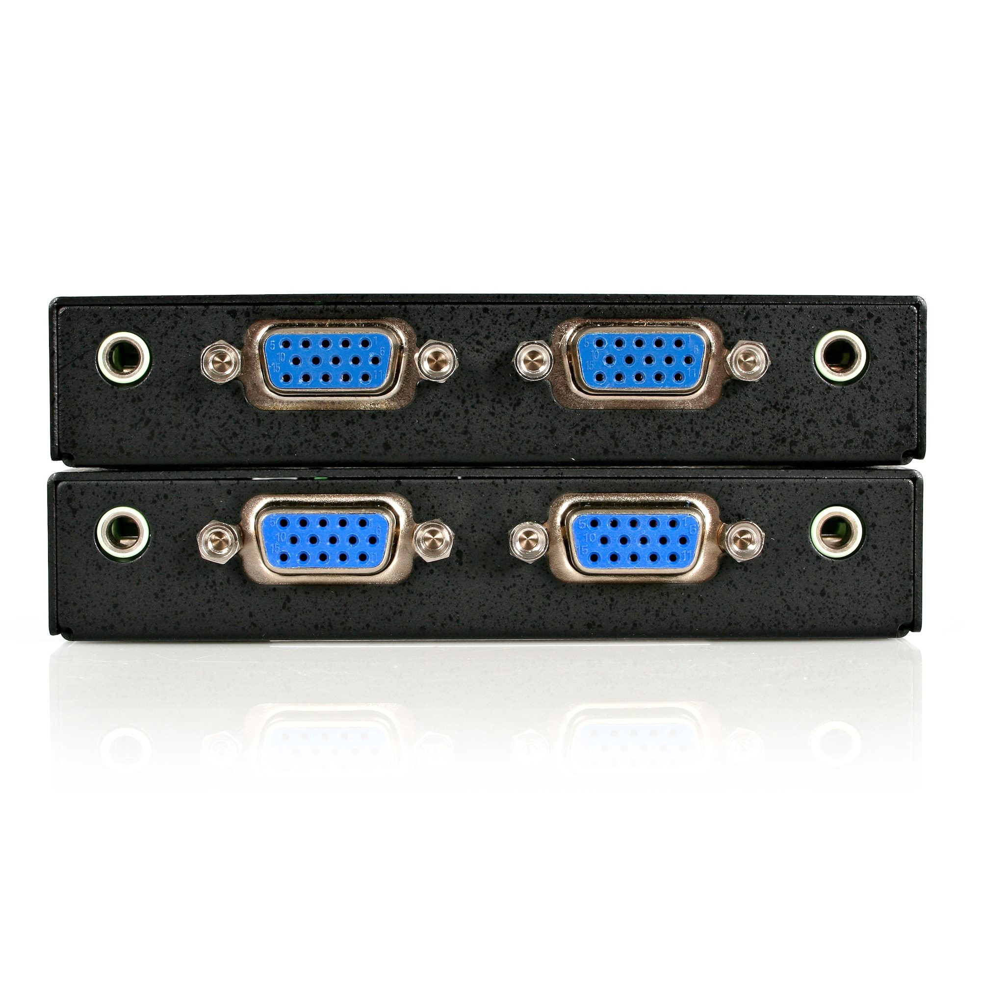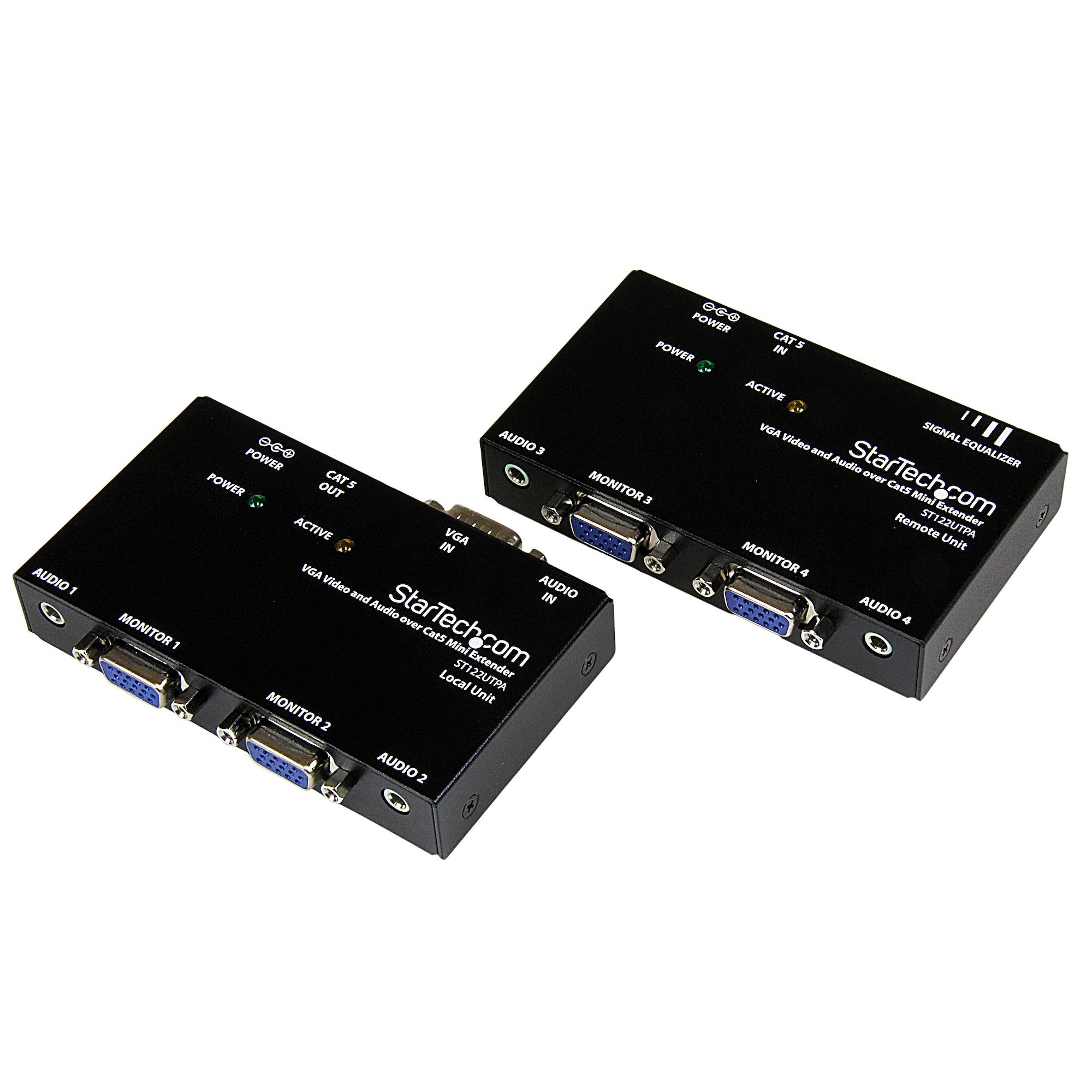 The ST122UTPA VGA Video Extender over Cat 5 with Audio allows up to 4 (2 local and 2 remote) monitors to be connected to a single PC. The video signal and corresponding audio are sent to the remote unit over standard 4 pair Category 5 or better (Cat 5e recommended) UTP cable, supporting extended video distances of up to 150m / 500ft.