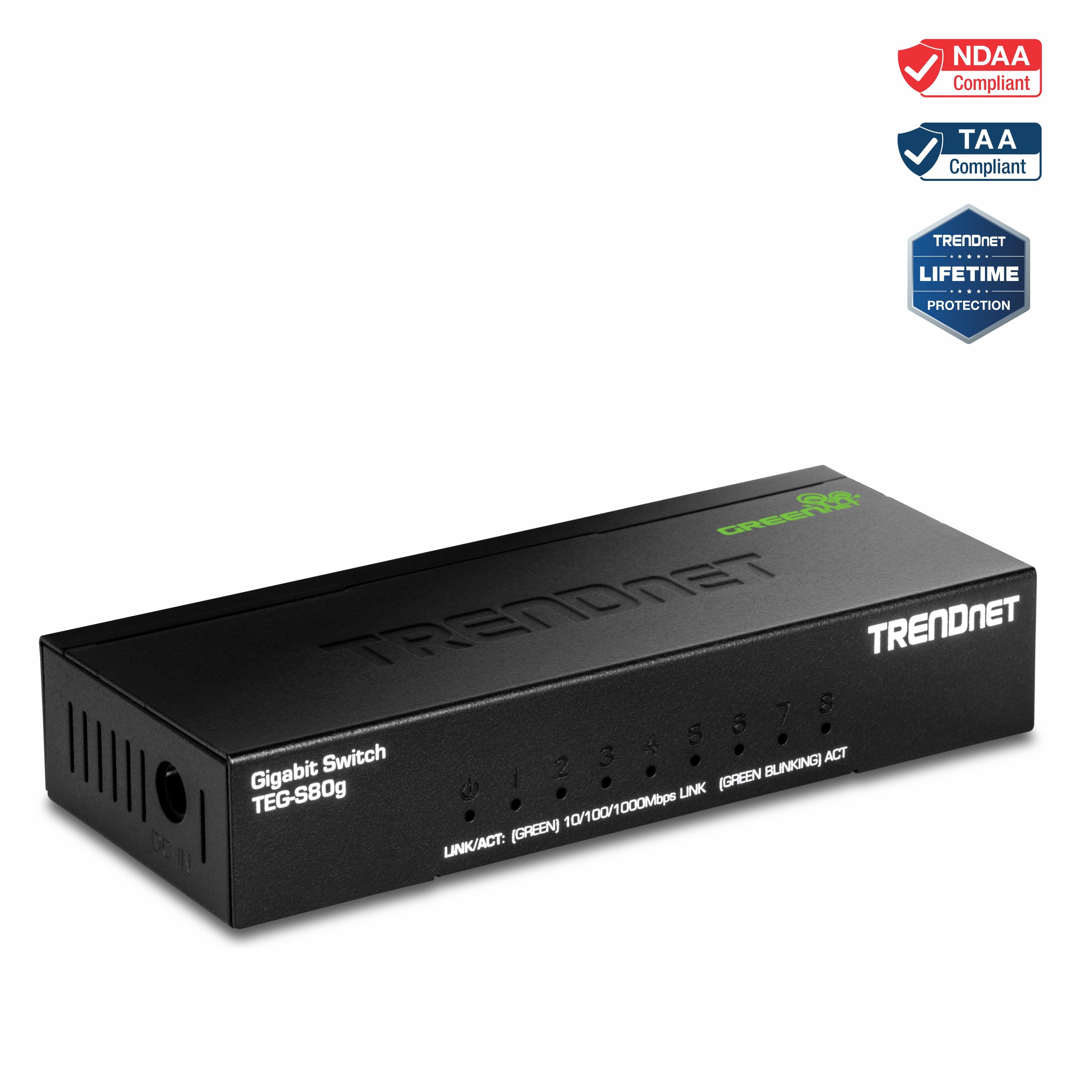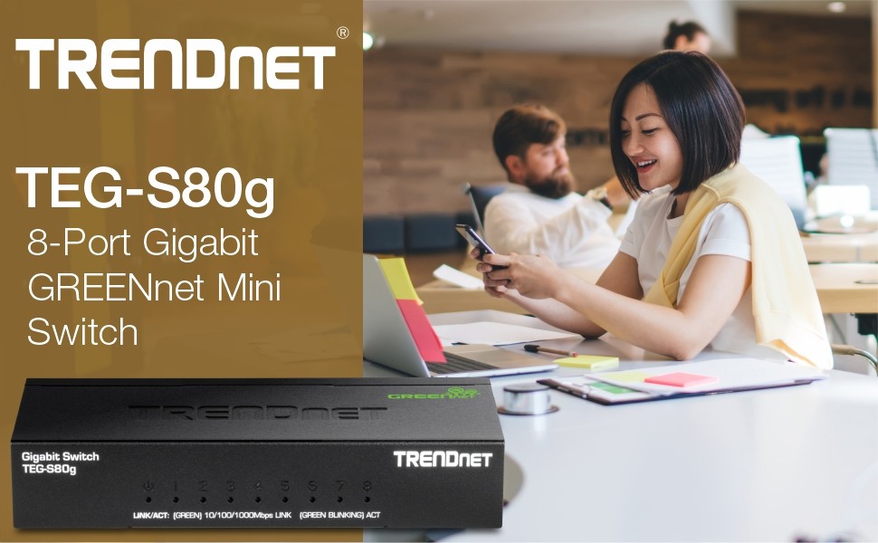 The 8-Port Gigabit GREENnet Mini Switch, model TEG-S80g, provides high-bandwidth performance, ease-of-use, and reliability, all from a tiny and durable metal enclosure, while reducing power consumption. GREENnet™ technology automatically adjusts power consumption as needed, resulting in substantial energy savings. Embedded GREENnet technology works right out of the box with no management requirement.