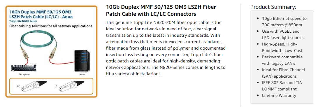 The N820-20M is manufactured using top quality materials. With 10Gb 50/125 duplex fiber, a Low-Smoke, Zero Halogen (LSZH) jacket, sturdy connectors and fiber made from glass instead of a polymer, Tripp Lite's fiber optic cables are made to last in high-demand data center and networking applications.