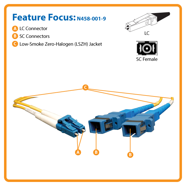 The N458-001-9 is manufactured using top-quality materials. It has 8.3/125 duplex (zipcord) fiber made from glass instead of a polymer, a low-smoke zero-halogen (LSZH) jacket and sturdy LC/SC connectors. The LSZH jacket limits the amount of toxic smoke emitted in case of combustion and is perfect for poorly ventilated areas. The connectors are thoroughly tested to meet stringent insertion loss standards.