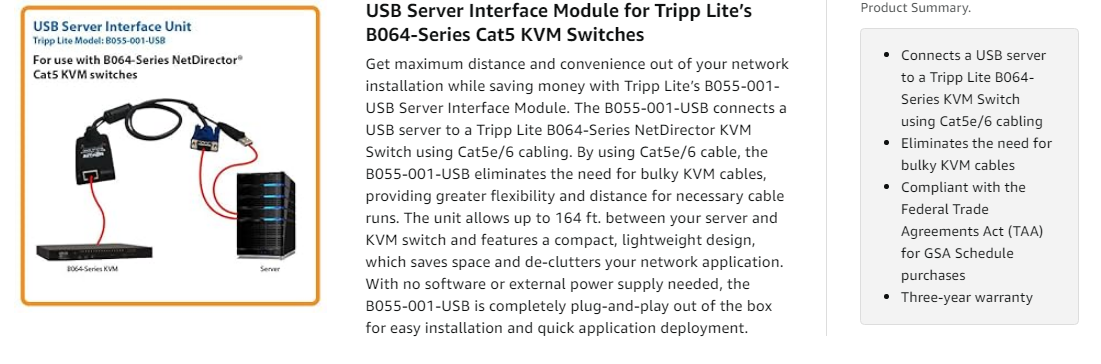 With Tripp Lite’s B055-001-USB, traditional KVM cables are a thing of the past. By using Cat5e/6 cabling, the B055-001-USB frees up space in your server cabinet and allows for increased ventilation, longer cable runs and greater savings. This server interface module is needed to connect a USB server to Tripp Lite’s B064-Series KVM switches.