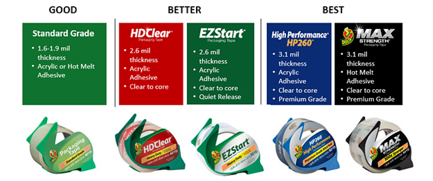 Each move, shipping and storage need is unique and you need a trusted packing tape to make sure your items get to where they need to be safely or are packed away the right way. From the long-lasting hold of E2 Start and HD Clear to the premium strength and durability of high performance HP260 and Duck Max, Duck brand has a packaging tape that's right for everyjob you can imagine, and a few you can't.