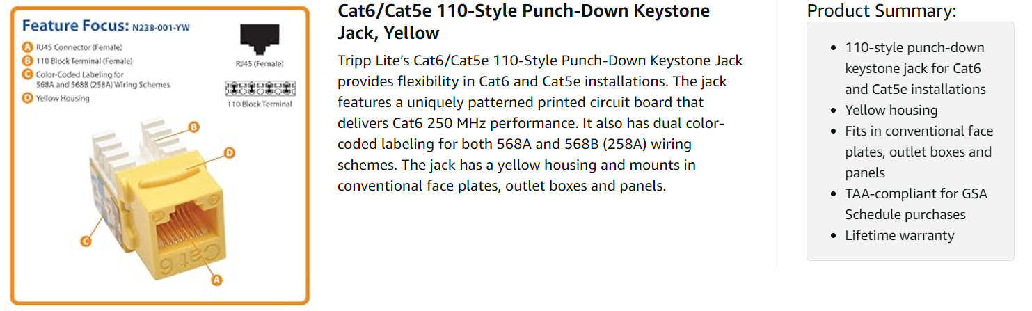 This keystone jack is fully compliant with EIA/TIA Cat6 connecting hardware specifications. It also meets UL-certified requirements for the ANSI/TIA/EIA-568-B.2-1 Permanent Link/Channel Identification Test for Category 6 cabling installations.