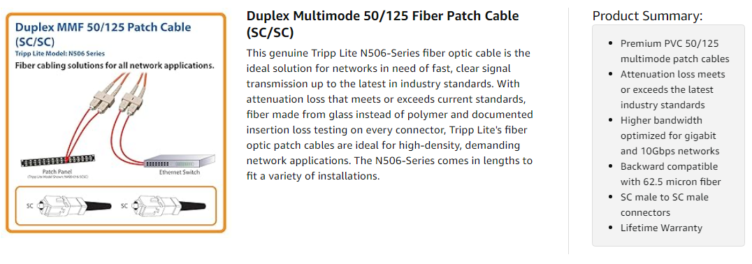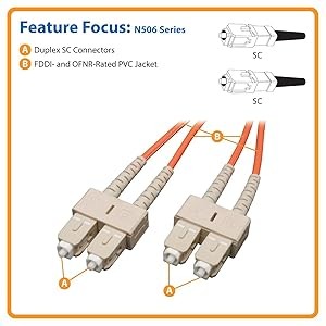 The N506-Series is manufactured using top quality materials. With 50/125 duplex fiber, a FDDI and OFNR-rated PVC jacket, sturdy connectors and fiber made from glass instead of a polymer, Tripp Lite's fiber optic cables are made to last in high-demand data center and networking applications.