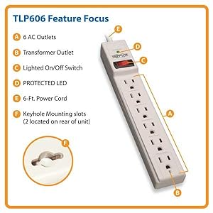 The TLP606 offers economical surge protection for PCs, peripheral devices and all electronics. It provides 6 AC outlets, including one outlet that accommodates a bulky transformer without blocking other outlets. A 6-foot cord enables connection to a distant wall outlet.