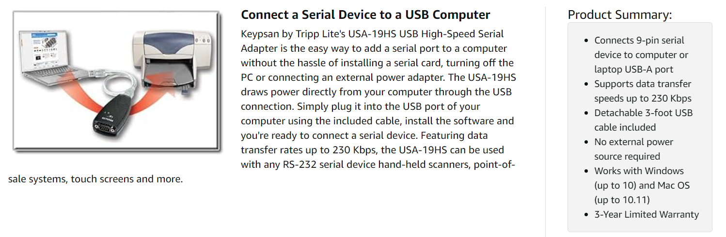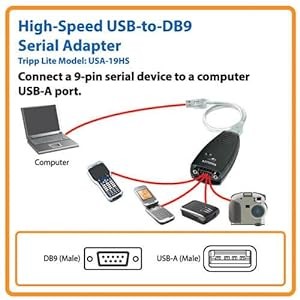The USA-19HS is easy to use. Its DB9 serial port is seen as a COM port by your computer, and is available for use by any program that accesses COM ports. It provides a simple way to add a serial port to a PC without the hassle of installing a serial card, turning off the PC or configuring IRQs.